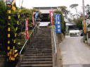 満福寺(まんぷくじ)・石段 江ノ電の踏み切りごしに急な石段が待っています。石段を登りつめたところに満福寺の山門が見えています。 |