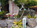 満福寺・弁慶の腰掛石 慰霊碑の左脇には弁慶の腰掛石。ちなみに弁慶関係の史蹟の文字は、義経の紅の色に対してすべて緑で統一されている。この腰掛石、大の男が座るにはちょっとカワイイ大きさかも。そういえば和歌山の田辺市(弁慶生誕の地)にもあったなあ。日本全国にいったいいくつあるんだ弁慶の腰掛石。 |