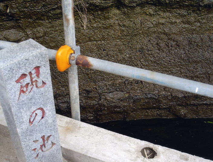 満福寺・硯の池 本堂裏の墓地へ抜けるトンネル脇に、硯の池(義経の依頼を受けた弁慶が腰越状を書くために水を汲んだとされる池)があります。一見、単なる溝のようなので見落としそう。さらには、この時ちょうど工事中のためポールが張り巡らされていたので、どんなアングルから撮ってもおそろしく殺風景な写真になってしまうのでした。ただでさえこちとら写真オンチなのに。トホホ… |