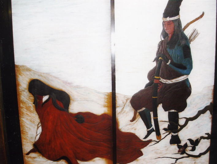 満福寺・鎌倉彫の襖絵 満福寺本堂には義経の腰越状(下書き)の版木が保管されているほか、義経の生涯を繊細な鎌倉彫で描き出した襖絵が有名、義経ファンは必ず観るべし!拝観志納であがらせてもらえます。 腰越状をしたためる義経、義経を慕い舞う静、雪の中を落ちゆく主従、弁慶の立往生など、義経物語の特に悲劇的な、そしてロマンチックな場面が襖の裏表三十二面に描かれています。憂いを秘めた義経の何と気品に満ちて美しいこと!思わずかぶりつきで見入ってしまいます。義経シリーズ以外にも、庫裡や天井などに鎌倉彫の装飾がほどこされ、それらの一部は絵葉書にもなっています。 左の写真は、義経シリーズで唯一絵葉書に入っていない襖絵。義経と静のせつない別れの場面です。 |