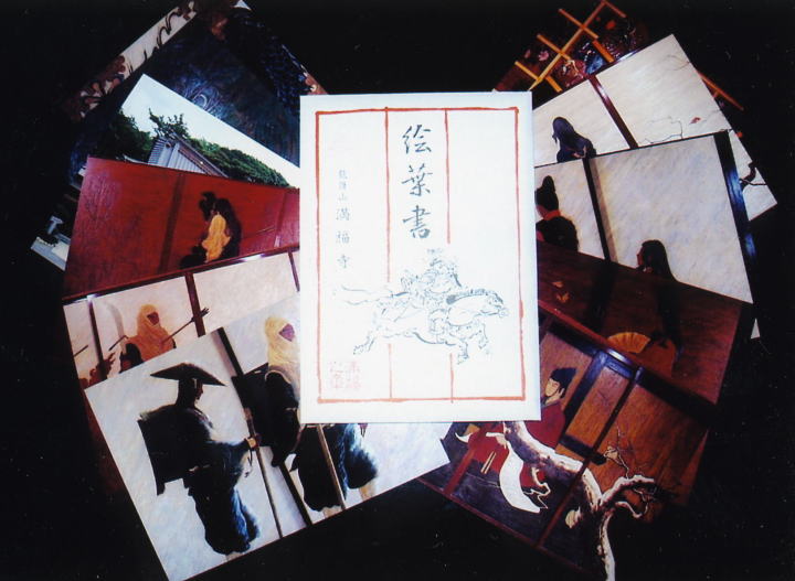 満福寺オミヤゲ・絵葉書 本堂全景の写真、本堂内の鎌倉彫の装飾、義経物語の襖絵など、12枚セット。(暗くて見にくい写真でごめんなさい) |