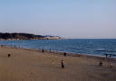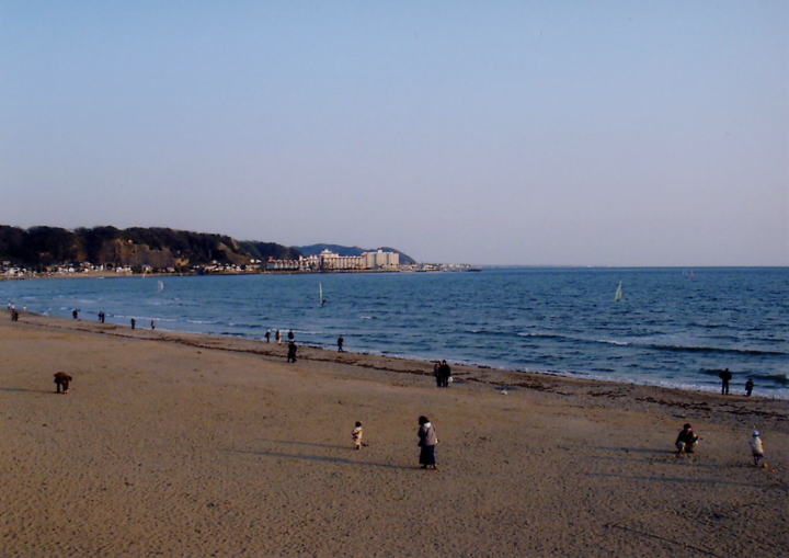 由比ガ浜 駅まで戻り、若宮大路を南へ向かえばほどなく海。遊歩道が整備されたレジャー向けの浜辺です。若者達は波乗りに興じ、家族連れはキャッチボールを楽しみ、犬はそこここを駆けまわる。かつてこの浜で、静御前の身ごもっていた義経の子が生まれ落ちてすぐ捨てられ殺されたのですが…そんないにしえの悲話を微塵も感じさせぬほど、今の由比ガ浜は大にぎわいでございました。 |