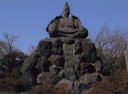 源氏山公園・頼朝像 それにしても鎌倉はなんとリスの多いこと。佐助稲荷から銭洗弁財天、さらに源氏山へと続く緑ゆたかな坂道を歩きつつ、ふと道沿いの木立に目をやると、必ずといっていいほどリスの姿が目にとまる。もとは江ノ島の動物園にいたタイワンリスが諸事情で放たれて、一挙に増えてしまったらしい。帰化動物は強いなあ…。 源氏山公園は、かつて源義家が出陣の際に源氏の白旗を立てて勝利を祈念したという山で、旗立山、白旗山とも呼ばれます。公園の中心部には高さ2メートルの威風堂々たる頼朝像が。男前です。彼にしてはめずらしい鎧姿。こうしてみると本当に武家の棟梁という感じ(イヤ本当に武家の棟梁なんですが)。 |