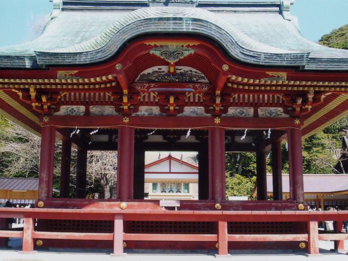 鶴岡八幡宮・舞殿(下拝殿) さらに参道を進むとあでやかな朱塗りの建物、舞殿(正式名称・下拝殿)が。静御前が頼朝の前で舞を奉じた場所とされており、毎年四月に開催される鎌倉まつりではここで披露される「静の舞」が目玉イベントになっています。が、鎌倉時代にこのような舞殿はまだなく、実際に静が舞ったのは若宮社殿の回廊だそう。ただ、かつてその回廊のあった場所が現在の舞殿のあたりだそうなので、一概にまちがいとも言えないでしょう。 |