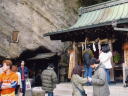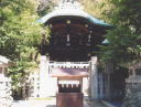 鶴岡八幡宮・本宮(の楼門) 舞殿の背後には、本宮へと続く急な石段。その左脇には、実朝暗殺時に公暁が身を隠していたといわれる有名な大銀杏がそびえています(写ってないけど)。石段を登って、さあ本宮へ・・・と思いきや、――何たることか!修復工事のため封鎖されている! …というわけで、石段の下からかろうじて見える楼門をむなしく見上げるよりほかない。鎌倉の直前まできて頼朝に会わせてもらえなかった義経の気持を、図らずも味わうことができました(苦笑)。 |
