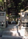 源頼朝墓 鶴岡八幡宮の境内を出、路地を東に向けて歩いて、頼朝の墓をめざします。八幡宮からだいたい徒歩5分ほどの距離。途中、清泉小学校の脇に大倉幕府(頼朝時代の政治機関の中心部)跡の碑が立っているのでチェック。そこからさらに路地を北に向かってもう少し歩いたところ、大倉山の中腹に、頼朝の墓があります。高さ2メートルほどの多層塔で、いい感じに苔むして木陰のなかにたたずんでいます。その脇には、希義(頼朝の同母弟)の墓の土(土佐から運ばれてきたもの)が盛られています。兄弟ともに安らかに眠ってね、ということらしい。…同じ弟でも同腹と異腹ではまったく扱いが違うのね…と思うと、何だか九郎がカワイソウでたまりません。 |