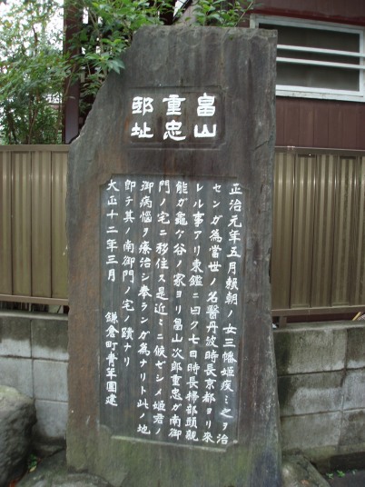 畠山重忠邸址 鶴岡八幡宮の東隣には、鎌倉御家人・畠山重忠の邸宅があったといわれています。かなりいい場所に住んでます。さすがさわやかイケメン好青年!(関係ない) それにしても義経はこの鎌倉でいったいどこに住んでいたんでしょう?それを示す痕跡はまったく残されていません。義経に夜討をかけた土佐坊昌俊の邸宅址にはご丁寧に石碑が建ってるというのに。 なので鎌倉に詳しい佐野様のご高察をもとに、義経のおうちを(勝手に)推理いたしました。まず第一候補は頼朝のもとで部屋住みという文字通りの御曹司パターン。そして、もし手勢を抱えていてそれなりの土地が必要だったとすれば、のちに永福寺(義経らの鎮魂のための寺院)が建てられた場所あたりがあやしいかも?また鎌倉に隣接する藤沢市も、義経にまつわる史跡が大事に守られていることから、この地に居を構えて土地の人々と親しく交流していたのでは…という見方もできます。それか最悪、どっか海辺のわびしい掘っ立て小屋とか。(笑)まあこれもファン的にはアリですが。なんといっても義経は不遇の似合う英雄ですから!むしろ不遇こそヒーロー・ヒロインの必須条件ともいえます。いじわる姉さん達にどなりつけられながら床を拭いてるシンデレラのイメージです。王子様は後白河法皇です。100%不幸にされます。 |
