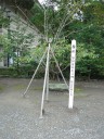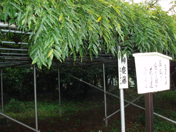 白旗神社・義経藤・弁慶藤 境内には、義経主従にちなむ植物がいくつか植えられています。まずは義経藤、弁慶藤。どこまでも対になっている睦まじい主従です。弁慶藤には藤色の花、義経藤には白い清楚な花が咲くそうです。花盛りの頃にまた来たいなあ…。 |