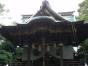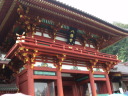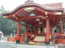 鶴岡八幡宮・舞殿 鎌倉に戻りふたたび鶴岡八幡宮の境内に足を踏み入れる頃には頼朝台風はますます猛威をふるい、鎌倉中のリスも吹き飛ぶ勢い。(※おおげさ)いつもは観光客でひしめく参道もさすがに人影はまばら。平成18年に改修されたピカピカの舞殿を見る、という目的は果たせましたが、頼朝兄上のお怒りを身を持って体験するというオプションまでついてきました。折りしもこのドシャ降りのなか結婚式が執り行われておりました。こんな台風呼んじゃってホントすみません、どこのどなたかわかりませんが。 |