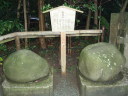 鶴岡八幡宮・鶴亀石 本宮の東側に鎮座する白旗神社(前回旅日記参照)の社前に、その名もありがたい「鶴亀石」があります。でもなぜいきなり鶴亀?と不審に思っていたら、“かつて鶴岡八幡宮の白旗神社の社前に義経と静御前の睦まじさを象徴した女夫(めおと)石と呼ばれる霊石があった”という言い伝えを佐野様が教えてくださり、もしかしてこれがそれではないかという話に。もしかしてどころか、場所的にも、石の感じからしても、ばっちりコレじゃないですか!もう決まり。これは女夫石です。(異論反論は受け付けません)名を変えられても、敬愛する頼朝兄上(白旗神社)の間近に恋人ともども居させてもらえるのなら、義経も幸せ…かな? ちなみにその義経静の女夫石にちなんだ銘菓が鎌倉駅近くの和菓子屋さん・松風堂で「義経静の女夫饅頭」として売られています。鎌倉では超貴重な、義経の名を堂々と冠したお土産です。義経ファンは絶対買うべし。 |