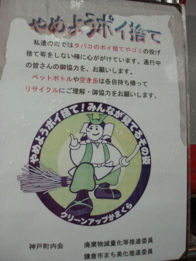 江ノ電・腰越駅 白旗神社を後にし、次は江ノ電で腰越へ。駅舎を出たところで、義経だか天狗だかよくわからない謎のキャラクターがポイ捨て禁止を呼びかけています。義経ファンとしては、頼朝に「やめよう(弟の)ポイ捨て!」といいたいところですが、これ以上怒りを買うわけにはいかないのでグッとこらえます。 |