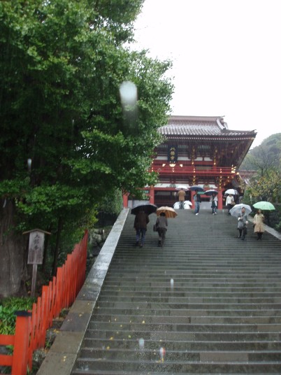 鶴岡八幡宮・本宮 正面の参道からぐる〜っと迂回して本宮にやっとたどりついたものの、オラオラ!といわんばかりに落ちてくる雨の激しさに、頼朝兄上のお怒りを身をもってひしひしと感じはじめ、とにかくゴメンナサイとお祈りしたのですが…忘れていました。兄上はいったんヘソを曲げちゃうとちょっとやそっとで機嫌を直してくれない御方だということを。「頼朝様イケメン!」「希代のカリスマ!」「偉大なる政治家!」「あれでけっこう優しいところもあるし!」等といまさら無理にほめたところで焼け石に水です。 |