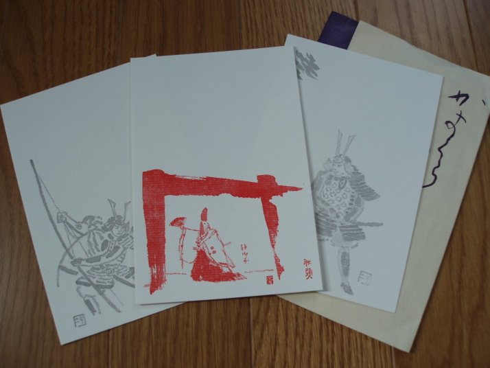 ![]() 和紙のお店「社頭」ではさまざまな柄の千代紙や和紙が置いてあり、私も切り絵用についいろいろ買い込んでしまいました。(ホクホク) 鎌倉みやげにぴったりのシックな絵はがきも各柄たくさん揃ってます。そのなかに、おーっ!ついに義経発見!?(写真右端)この兜の鍬形、凛々しく涼やかなお顔、これぞ義経様でなくて誰であろう!…しかしタイトルは「若武者」。え〜…。そういえば鶴岡八幡宮のいかにも義経っぽいお守りも「若武者守」だったし、ハハーンわかったぞ!鎌倉では義経の名を大っぴらに出せないものだから、かわりに「若武者」と呼ぶのね!もう一枚は静の舞(写真中央)、そして馬上武者(写真左端)です。こちらも若武者と顔が同じだから義経ですよね〜♪(異論反論は受け付けません) 「社頭」営業時間/10:00〜18:00 定休日/なし |