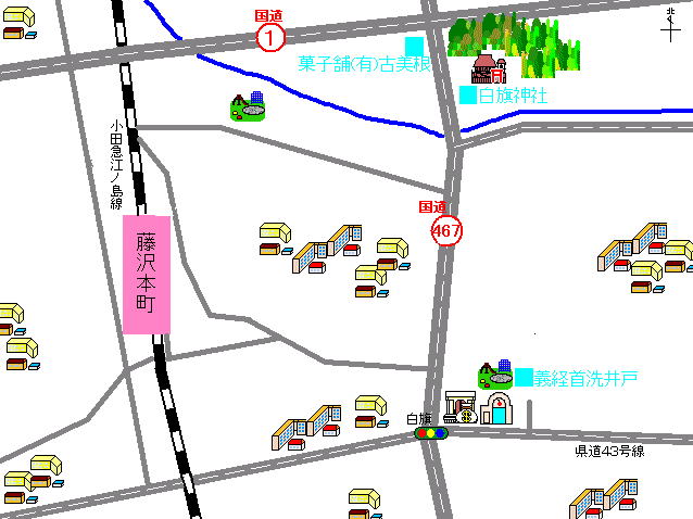白旗神社・本殿 石段を登りつめたところに本殿があります。義経の首にまつわる藤沢の伝説は信憑性に乏しいともいわれていますが、この地に立ってみると、なんだか義経の気配が感じられるようで、伝説も本当のような気がしてきます。実際、この藤沢には古来より鎌倉と都を行き来する街道が通っていたといいますから、義経もこの場所を幾度となく通ったことでしょう。 |