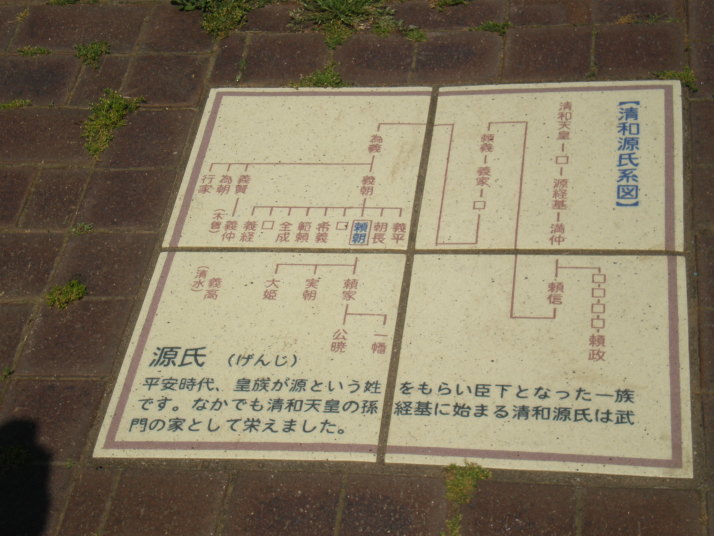 歩道の案内プレート 歩道の地面には韮山にまつわる歴史上の人物や逸話などを記したプレートがズラリと埋め込まれています。トップは頼朝公のおなじみのこのお姿。知らずにいきなり踏んでしまいそうになってあせります。踏み絵か!彼を怒らせたらどんなことになるか前回の旅行で骨身にしみてわかっているので過敏になってます。 ご丁寧に源家の系図まできちんと紹介されてます。頼朝のみ目立つようになっているのは当然として、□(四角い囲み)だけで紹介されている弟達が悲しい。彼らもいちおう名前あるんだけど…。 |