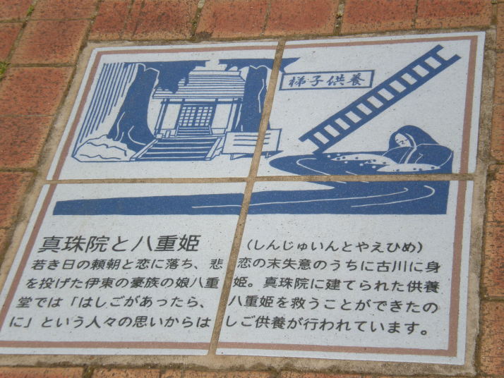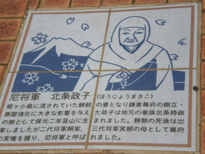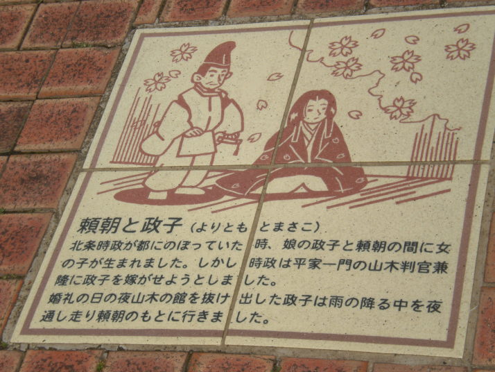 歩道の案内プレート・政子登場 頼朝の人生・功績を語る時、欠かすことができないのが北条政子の存在。そのふたりの出会いを描いたプレートもあります。おー政子がかわいい!超可憐!(写真上)しかしその次のプレートがこれ(写真下)。ええーいきなり尼将軍?時間の流れ残酷すぎるだろ!この間にせめて静の舞とか大姫のエピソードとか入れたらちょうどいいクッションになるのに…でも義経&静や大姫らについてのプレートはありませんでした。頼朝政子にとっては彼らにまつわるエピソードは黒歴史なのか… |
