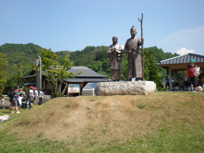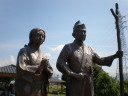 頼朝と政子の像 蛭ヶ小島跡地は茶店や東屋、駐車場などが完備された公園になっており、その小高い場所に若き頼朝と政子の像「蛭ヶ島の夫婦」が建てられています。乙女ポーズの政子がキュート。頼朝はどうしても中井貴一さん似。その表情をもっと近くで撮ろうとしたら、鉄塔をグワシと握るゴジラ頼朝みたいなアングルになってしまいました。 公園内にはほかにも頼朝政子にまつわる石碑・モニュメントがいくつか建てられていて、この若き夫婦への愛情に満ちています。いいなあ〜義経と静のツーショット銅像や記念公園もつくってほしいなあ!(結局そっちか) |
