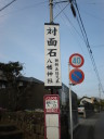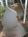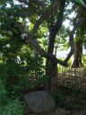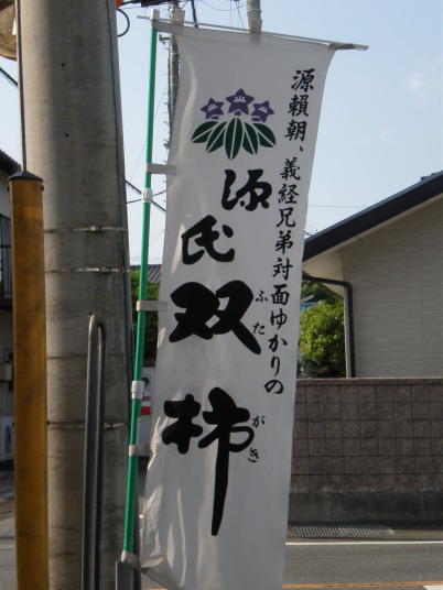 八幡神社・ねじり柿 兄の石の背後から二本の柿の幹がねじれるように生えています。(わかりにくい写真でゴメンナサイ)この柿の木も兄弟対面ゆかりの木として伝えられていますが、「頼朝がこの場所で柿を食べたが渋柿だったので種をねじって捨てたところ芽が出た」「頼朝と義経が対面の記念としてみずから植えた」「頼朝と義経が対面の際ともに食べた柿がとても美味しかったので一緒に種を植えた」「頼朝と義経が再会を喜び夢中で話している時に食べていた柿の種から芽が出た」等、微妙に違うバージョンがいくつか伝わっています。渋柿だったので捨てた説ではちょっとさびしいので、やはり義経ファンとしてはふたりで一緒に食べて植えた柿ということにしたい。そのふたつの柿がからみ合いねじれて育ったというのも「関係がグネグネねじれてしまった」「ふたり仲良くひとつの木になった」とふたとおりの解釈ができてしまうのがニクイところ。 |