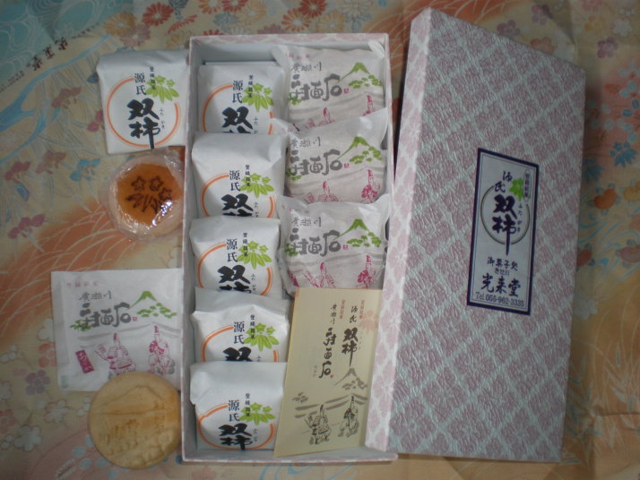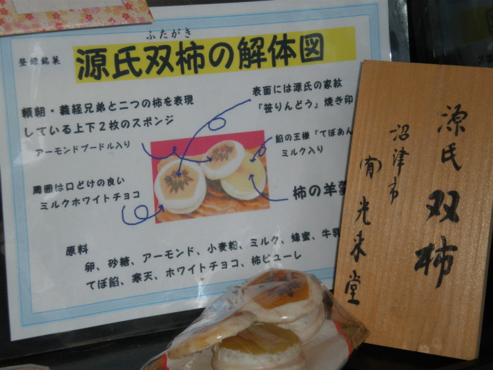 ![]() 「源氏双柿」「黄瀬川対面石」はいずれも各¥130。その二種が10個詰め合わせになっている化粧箱入りセットは「義経物語」として販売されてます。「義経物語」!どちらかというと頼朝ホームのこの地で義経のほうに花を持たせてくれるこのネーミングがまた嬉しいではありませんか。 |