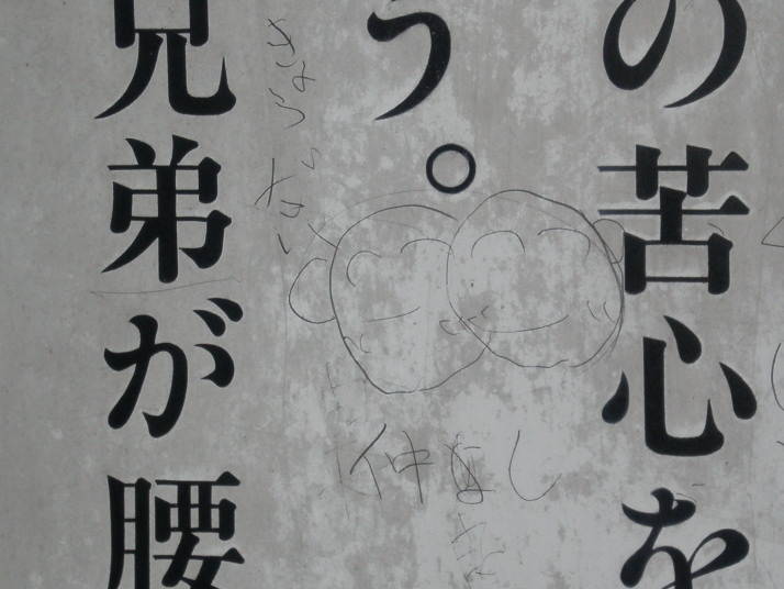 八幡神社・対面石 八幡神社本殿の裏手(西側)に対面石があります。写真の右手前が弟義経の、左手奥が兄頼朝の座った石とされています。当然と言えば当然ですが兄の石のほうがやや大きく、高い位置にあります。けっこう距離近い!まさに膝突き合わせる状態。こんな至近距離で義経の瞳うるうるビームを食らったら私が頼朝ならまず卒倒します。そして幕府のことなんか北条氏に丸投げして毎日義経と遊ぶ。その時 歴史が終わった。よかったね、そんな頼朝じゃなくて。 石の脇には案内板が建てられています。その案内板の文面にいたずら書きが…!いたずら書きダメ!ゼッタイ!…とはいえ「きょうだいなかよし」の文字とピッタリ寄り添うニコニコ顔ふたつについ癒されてしまった… |