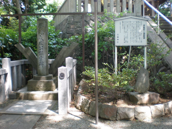 白旗神社・義経公鎮霊碑・「義経松」石碑 本殿へ向かう石段の途中には兜の形を模した義経公鎮霊碑があり、その右脇には「義経松」と記されたちいさな石碑が。石碑の後ろには松らしき切り株も。これは境内にある「弁慶松」の対になるものでしょうか?ほかにも境内には「義経藤」「弁慶藤」があり、この主従がいかにこの地で二人セットで愛されているかがうかがえます。 短い生を生きる人間にくらべると樹木の命の長さは永遠に近い、それでもやはり寿命はある。この義経松も長く人々に愛された末、終焉の時を迎えたのでしょう。木も人と同じように代を重ねてゆくことができるから、この義経松もいつの日か「二代目」の登場を期待したいところです。 |