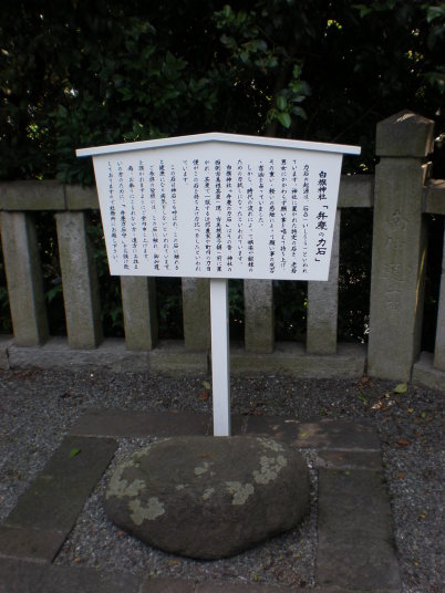 白旗神社・弁慶力石 本殿の脇の弁慶力石、以前は「弁慶力石」という文字のみの小さな立て札のみだったのが、ごらんのように詳細が記された立て看板になっています。古くは石を持ち上げて運気を占う「石占(いしうら)」に用いられ、時代が下ると地元の人々の力比べの石として親しまれるようになったとか。またこの石に触れれば無病息災の御利益があるそうで、そんな言い伝えにちなんだかわいいお守り「弁慶の力石守」も登場してます。 |
