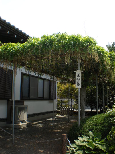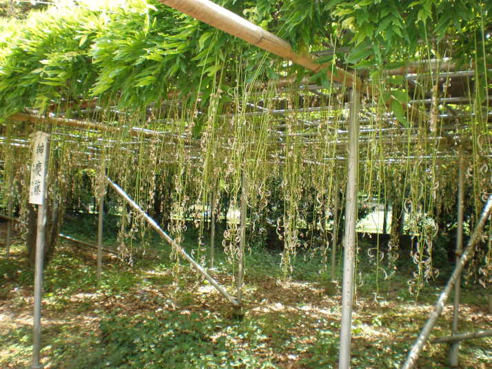 白旗神社・義経藤・弁慶藤 白い義経藤と藤色の弁慶藤。残念ながら花の時期は終わっていましたが、花の房がまだかろうじて残っており、華やかな姿をしのぶことができます。やや小ぶりの可憐な義経藤にくらべて弁慶藤の房の大きいこと!地面についてしまいそうな勢いです。 |