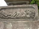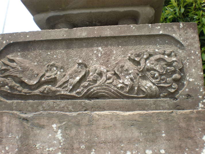 藤沢市・白旗神社前の御典橋と大御神灯(石灯籠) 藤沢市の義経首塚は、腰越での首実検ののち浜に打ち捨てられた義経の首が境川をさかのぼってこの地に流れ着いた、という伝説がもとになっています。また一説には亀が義経の首を甲羅に乗せて運んできたとも…。義経を祀る白旗神社の前にはその境川の傍流白旗川が流れており、橋のそばに立つ大御神灯や境内本殿には亀の姿が描き出されています。 |
