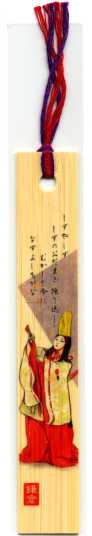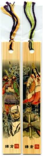 「古都鎌倉・雅」栞(各¥320) 外国人観光客が喜びそうな和風の木製栞。この2種のほかにもいろんな絵柄が出てます。義経の鎧が漫画やドラマ等でよくある赤いものではなく「平家物語」の描写に沿った紫裾濃縅(佐野様作品の義経もこの鎧!)になっているあたりマニアックでレア感をそそる。それにしても義経&弁慶のほうはともかく、静御前と頼朝のツーショットってどうなの。背後からにらみをきかせる静、気まずそうに目をそらす頼朝。どんなシチュエーション…このあと静がさらににじり寄り、手にした扇をハリセンよろしく振り下ろすのですね。頼朝の頭上に。(だからやめろってそういうこと言うの) |