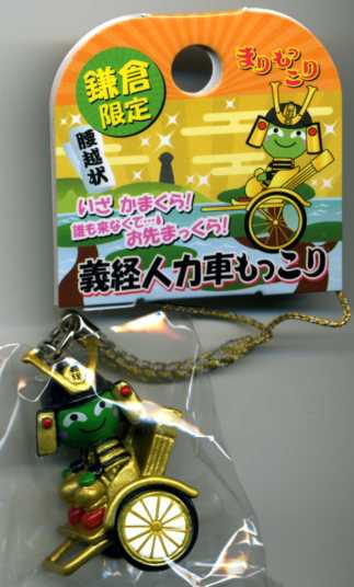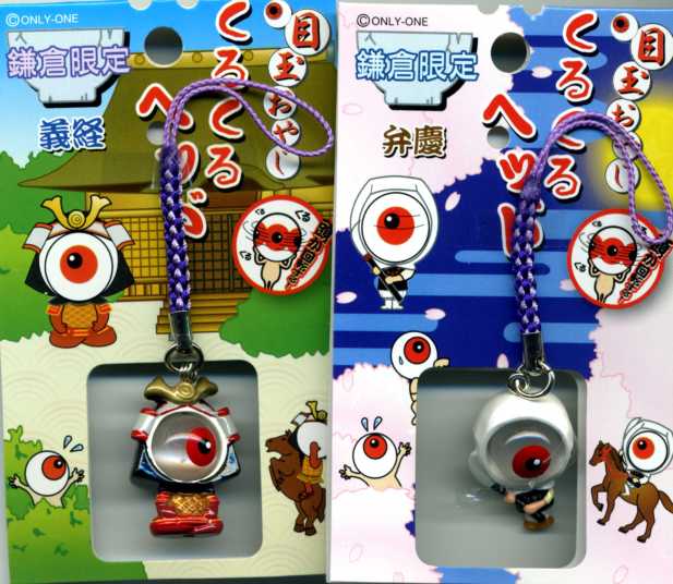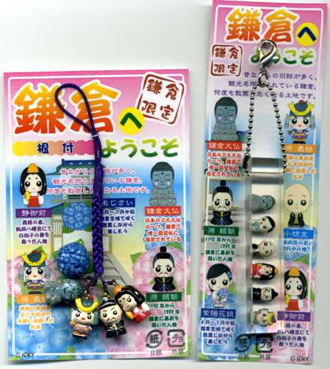 「鎌倉へようこそ」根付2種(各¥520) 既存のご当地ものキャラとは一線を画す素朴なキュートさがたまらない鎌倉限定商品。イチオシです。豆粒大のプチ人形になった義経と静、そして頼朝もかわいいよー!なぜか鎌倉大仏が、そして「小坊主」「紫陽花娘」なる謎のキャラがしれっとチームに加わってるのも笑えます。 |