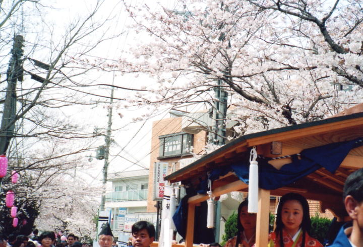沿道の桜並木 多田神社境内から国道173号線に出るまでの路地には見事な桜並木が。絢爛たる眺めを満喫し、沿道の見物客たちからは手を振ってもらえ、こんなにイイ思いをしていいのかしら…とボーゼン。一生の思い出になる幸せな体験でした。 |