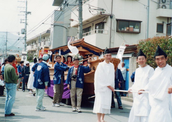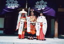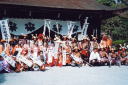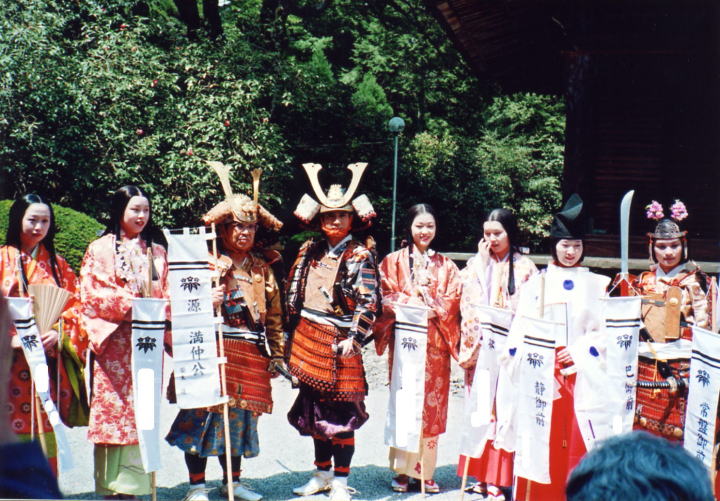 兵庫県川西市は清和源氏発祥の地として有名で、JR川西池田駅ロータリーには始祖・源満仲の騎馬姿の銅像が建っています。この源満仲を筆頭として清和源氏ゆかりの武将を祀っているのが多田神社。毎年四月にはこの神社を中心に市をあげて源氏まつりが催されます。見どころは、豪華絢爛な懐古行列。源満仲をメインに、頼光や頼朝、義経などの源氏武者や巴御前など姫君ら総勢1000名以上が、多田神社周辺の約3キロの道程を勇壮に練り歩きます。 去る2000年私は行列参加者の一般公募にダメモトで応募したのですが、なんと「公家姫」役に選んでいただき、この華麗な催しに参加することができました。ありがたきシアワセでございました。 |