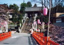 多田神社・南大門前 阪急・川西能勢口駅から、バスで行くなら阪急バス清和台方面行きで約15分、電車なら能勢電鉄妙見線に乗り換え多田駅で下車、そこから西に徒歩20分ほど。市街地から離れているためふだんは閑静な鎮守の森といったたたずまいですが、年に一度の源氏まつりの日は、幟(のぼり)や提灯が沿道ぞいにびっしり飾られ境内も大賑わい。 |