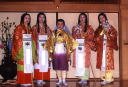 公家姫・武家姫と牛若丸 着付け完了の記念写真。右から武家姫2名、牛若丸、公家姫2名。いずれも公募で選出された面々です。ちなみに一番左端が不肖管理人。呆けててすみません。 |