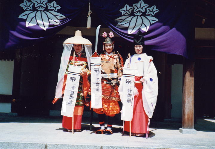 巴御前・静御前・常盤御前 源氏まつりの華・凛々しい巴御前、可憐な静御前、たおやかな常盤御前のお三方。こちらも公募で選ばれたみなさんです。 |
