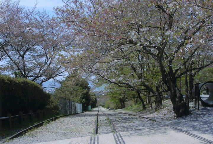 蹴上インクライン 義経大日如来から眺めるインクライン。私が訪れたのは四月の中旬、桜は盛りをすぎたとはいえ、ラインに沿って延々つづく並木はみごとなもの。平日だったこともありますが人影も少なく、見晴らしもよく、隠れた名所といえましょう。ここからさらに足を伸ばすと最近よく観光雑誌などで紹介されるモダンな疎水アーチが姿を見せ、さらに進むと「絶景かな絶景かな」の南禅寺にたどりつきます。 |