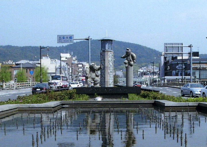 五条大橋・牛若丸と弁慶の像 「義経記」では三度も対戦している牛若丸と弁慶ですが、文部省唱歌「牛若丸」では舞台を五条大橋に設定し、より象徴的に両者の戦いが歌われています。橋の手前の中央分離帯の植え込みの中(なので遠くからしか見ることができず・あげくピンボケ写真)には、丸々としたカワイイ牛若丸・弁慶像(京都の御所人形のイメージだとか)が建てられています。なだらかな東山の稜線を背景に、たしかにこれは一枚の絵のように決まるワンシーン。 |
