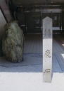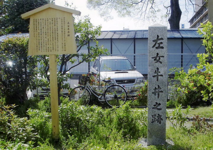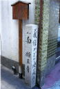 源義経産湯井ノ遺址 牛若丸誕生井から5分ばかり歩いた場所にも牛若丸誕生にまつわる碑があります。この周辺にかつて源義朝の別邸があったらしい。今は車が行き交う道路の脇に、この石碑のためにわずかなスペースが空けられているのみ…。 |