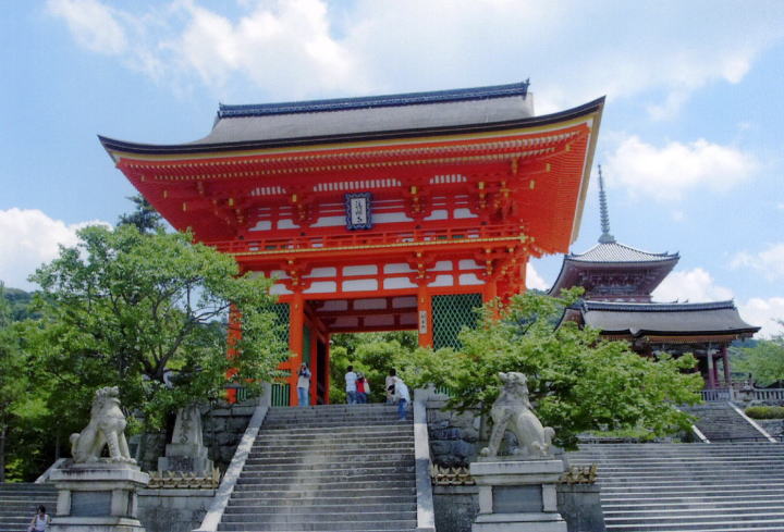 清水寺 五条天神から始まった弁慶と牛若丸の対決、最終ラウンドは清水寺の「舞台」。清水坂での小競り合いのあと、参詣客にまぎれそしらぬ顔して堂内で読経していた牛若のもとに弁慶乱入!牛若少しもさわがず「まあ座ってお前も経を読め」。弁慶、なぜかおとなしくとなりに座って一緒に読経(このへん弁慶の大らかさが感じられていいなあ)。それがすむと「さあ勝負」と手合わせがはじまります。参詣客も修行者も勤行を忘れてこのミョーなバトルをヤンヤと観戦。弁慶は牛若丸の妙技に翻弄され、感服し、はれて主従の契りを結ぶのです。 写真はあえて有名な清水の舞台ではなく(舞台はちょうど改修工事中!ありゃ〜)、青葉に映える鮮やかな仁王門。背後は三重塔、いずれも重要文化財です。 ※07年旅日記に清水寺の弁慶ゆかりの史跡・常盤ゆかりの子安の塔追加! 拝観料・大人¥300(本堂) 時間・6〜18時 |