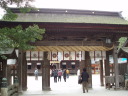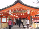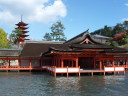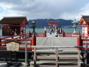厳島神社・入り口/回廊 さあいよいよ厳島神社の社殿へ!折りよく満潮、波の上の回廊を歩けるとあって参拝入り口はゴッタ返し、人波が途切れることがありません。 厳島神社は周囲の海や森林を含めて1996年12月に世界文化遺産に登録されており、本社本殿などの建造物も国宝・重要文化財に指定されています。 祭神は市杵島姫命(いちきしまひめのみこと)・田心姫命(たごりひめのみこと)・湍津姫命(たぎつひめのみこと)の三柱の女神様。荒ぶる神スサノヲが、姉アマテラスに謀反の心のない証として生み出した美しい女神様達です。このエピソード、どうも頼朝義経兄弟にかぶらせてしまう…兄に一途に尽くした義経だって清らかでまっすぐな心の持ち主、女神様を生めと言われれば生めるわい。(おい無茶いうな)神話と比べて歴史はやっぱりシビアで世知辛い… 神社の創建は推古元年(593年)で、のち仁安三年(1168年)に平清盛によって現在のような壮麗な社殿が造営されました。海上に浮かぶ寝殿造りの社殿は実に美しく雄大で、清盛の卓越したセンスと独創性を感じます。幻想的でロマンチック、あまりの美しさに儚さすら感じさせるこの光景は平家の栄華の象徴ともいえ、源氏の都・鎌倉のどっしりとした質実剛健さと好対照をなしています。 拝観料¥300 拝観時間6:30〜18:00(季節によって変更あり) 年中無休 |