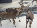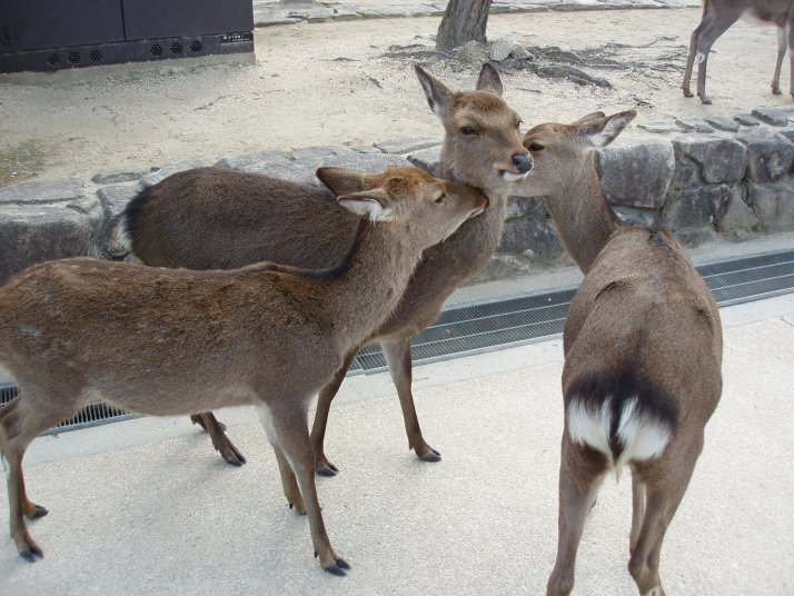 いちゃつく鹿 宮島に来て何が驚いたって、鹿のおとなしさ。奈良公園の凶暴鹿(パンチ&キック・噛む・角で刺す・ポケットのものを強奪etc)しか知らない私にとって、人を襲いもしなければ逃げもせず観光客の間を悠然と歩く鹿の姿はちょっとしたカルチャーショック。神の使いとして大切にされているのは奈良も宮島も同じですが、こちらは数年前に餌をやってはいけないというきまりができたからかな?ともあれ逃げない&襲ってこない鹿に感動した私は史跡そっちのけで鹿の写真ばっかり撮っていた。 この写真は二頭の鹿に両サイドからラブラブアピールを受けご満悦のモテ鹿。(雄か雌かわからんが)観光客に囲まれようが写真を撮られまくろうがお構いなしに延々といつまでもいつまでもチュパチュパ毛づくろい。実に円満な三角関係です。義経と静御前&正妻もたぶんこんな感じ。静御前「殿大好き♪」正妻「私も好き〜♪」義経「…(←何も考えてない)」 |