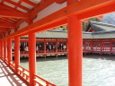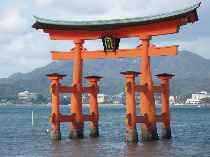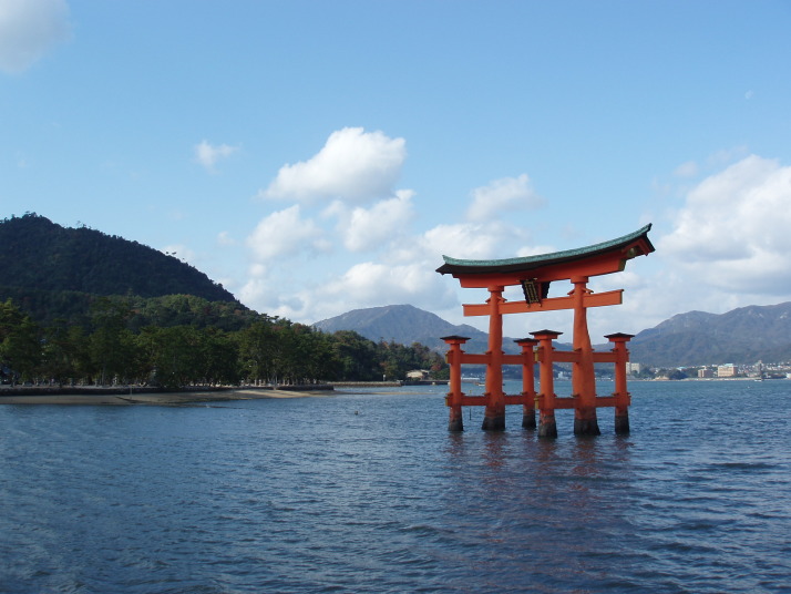 大鳥居 遠くからでもよく目立つ、宮島の象徴・大鳥居。高さは約16メートル!紺碧の海と島の緑に鮮やかな朱塗りの大鳥居がよく映え、すばらしい景観を演出しています。干潮時には歩いてすぐそばまで行くこともできるそうです。 この鳥居から本土をつなぐ海上の道がいわば厳島神社の「正式な」参道であり、今現在「表参道」と呼ばれているお土産物店のつらなる通りは観光用にそう呼ばれているだけ…だそう。(遊覧船の熱いガイドさんいわく)いずれにせよ海の上の参道なんて神秘的で、厳島神社ならではの光景ですね。 |