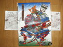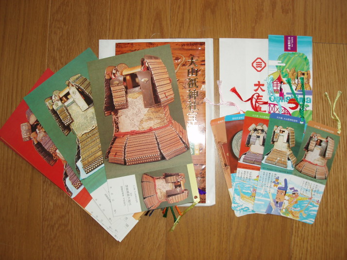 絵はがきセット¥500/しおりセット¥100 大山祇神社オリジナルの絵はがき&しおり。絵はがきは8枚入り、しおりは5枚入りでどちらにももちろん義経鎧の写真が入ってます。しおりのほうはそれぞれの武具にまつわる簡単な説明文とイラストつき。でも義経の鎧だけなぜかイラストが那須与一…。(怒) |