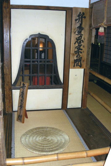 吉水神社・弁慶思案の間 潜居の間の隣にある一畳敷きは「弁慶思案の間」と名づけられています。弁慶はわざわざこんな小さな空間に巨体をつめこみひとり何を思案していたというのでしょう。やはり今後の苦難を思い、主義経を何があっても守り抜くべく決意を固めていたのでしょうね。案外「ハラへった〜」「メシ食わせ〜」とか煩悩まみれなこと考えてたりして。 |