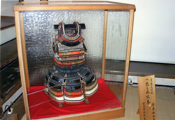 吉水神社・伝義経の鎧(重要文化財) 潜居の間に飾られている伝・義経着用の鎧「色々威腹巻(いろいろおどしのはらまき)」。時代を経ても見劣りしない見事な細工にうっとり…したいのはやまやまなのですが、あのうコレ…幼児用ですか?五月人形でよく見かける「お子様もお召しいただけます」という鎧みたい。いくら義経が小さいからってあんまりだ!私は義経はチビでも全然かまわない派なのですがこれはさすがにフォローできない。どうみても成人男子が着用できるもんじゃありません。 |