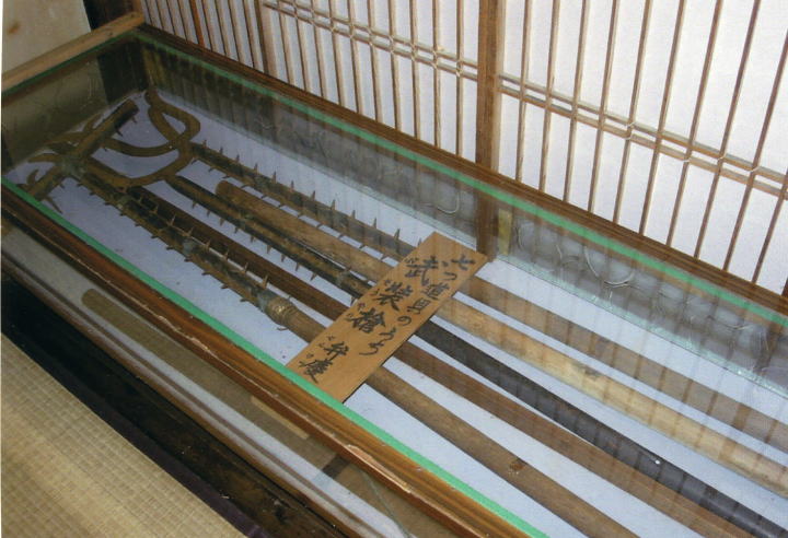 吉水神社・弁慶七つ道具 潜居の間から奥へ進むとさまざまな宝物が展示されています。まずは弁慶の七つ道具のうちから槍をいくつかセレクト。長くて写真に納まりきらない…こんなものを弁慶ら僧兵たちは自在にふりまわしていたんですね。 |