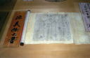 吉水神社・義経の書 義経自筆のものと伝わる書。何と書いてあるのかはよくわかりませんが、義経らしい流れるような勢いのある筆致です。別の間には弁慶の手によるという掛け軸も残されています。こちらは案外お行儀よく整った字でした。 |