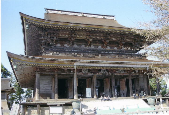 金峯山寺(きんぷせんじ)・蔵王堂(国宝) 吉水神社から門前町をしばらく歩くと吉野のランドマーク「蔵王堂」にたどりつきます。 東大寺の大仏殿に次ぐという巨大木造建築は高さ34メートルの重層入母屋造。その威容を秋のすがすがしい青空に伸びやかに誇っておりました。 『義経記』によると義経と別れた静御前は供の男らにも見捨てられ、ただひとり雪の吉野をさまよい歩き疲労困憊の末、蔵王権現の灯りを見つけてようやくひと心地つきます。文治元年11月17日のことです。静はここでいったん捕まるものの、執行(お寺のえらい人)の宿に泊めてもらい、翌日母親の住む京都の北白川まで送り届けられるなど、終始大事に扱われました。静御前のいたましくも凛とした姿に荒くれ者の僧兵たちも心を動かされたのでしょう。 |