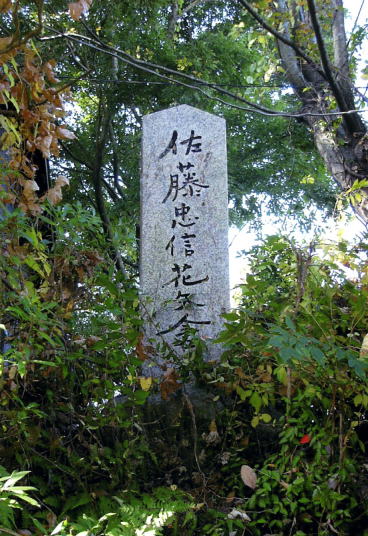 佐藤忠信花矢倉の石碑 花矢倉展望台からすぐ下の道路わきには忠信の戦いを標す石碑があります。藪の中にひっそりたたずむひかえめなその姿は、忠臣・佐藤忠信の謙虚にして実直な姿にも重なります。少し降りた場所には花見用の小屋と忠信の戦いをくわしく解説した案内板も立てられています。 |